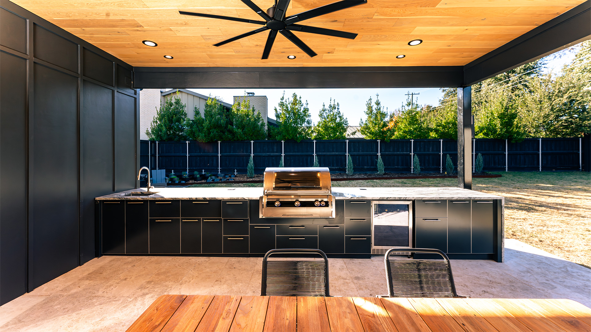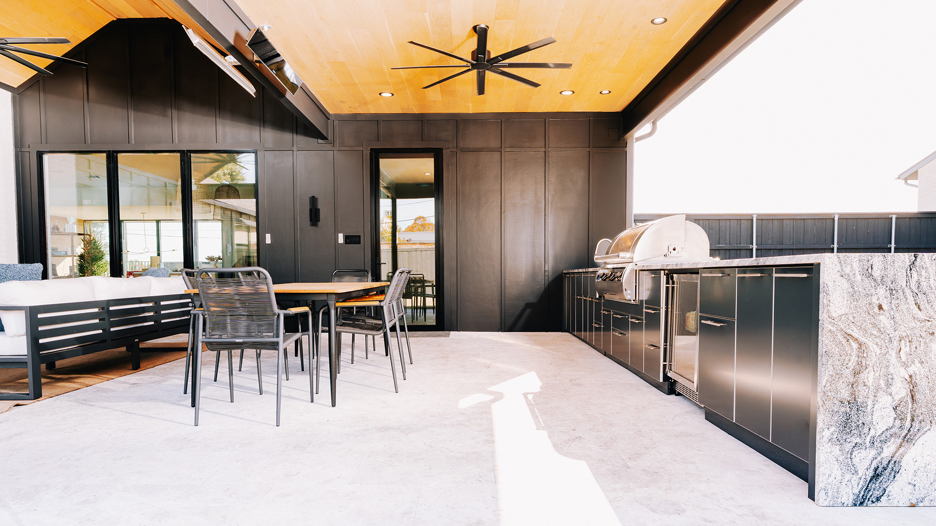 An L-shaped outdoor kitchen becomes the focal point, equipped with top-of-the-line appliances and adorned with premium granite countertops that exude elegance and durability. The kitchen and columns are wrapped in exquisite ledgestone, adding texture and warmth, while the ceiling features pre-stained tongue-and-groove pine, creating a polished, inviting ambiance.