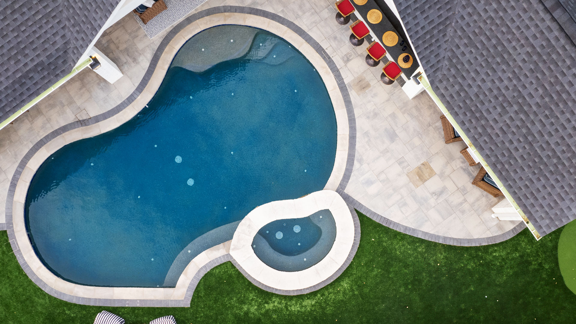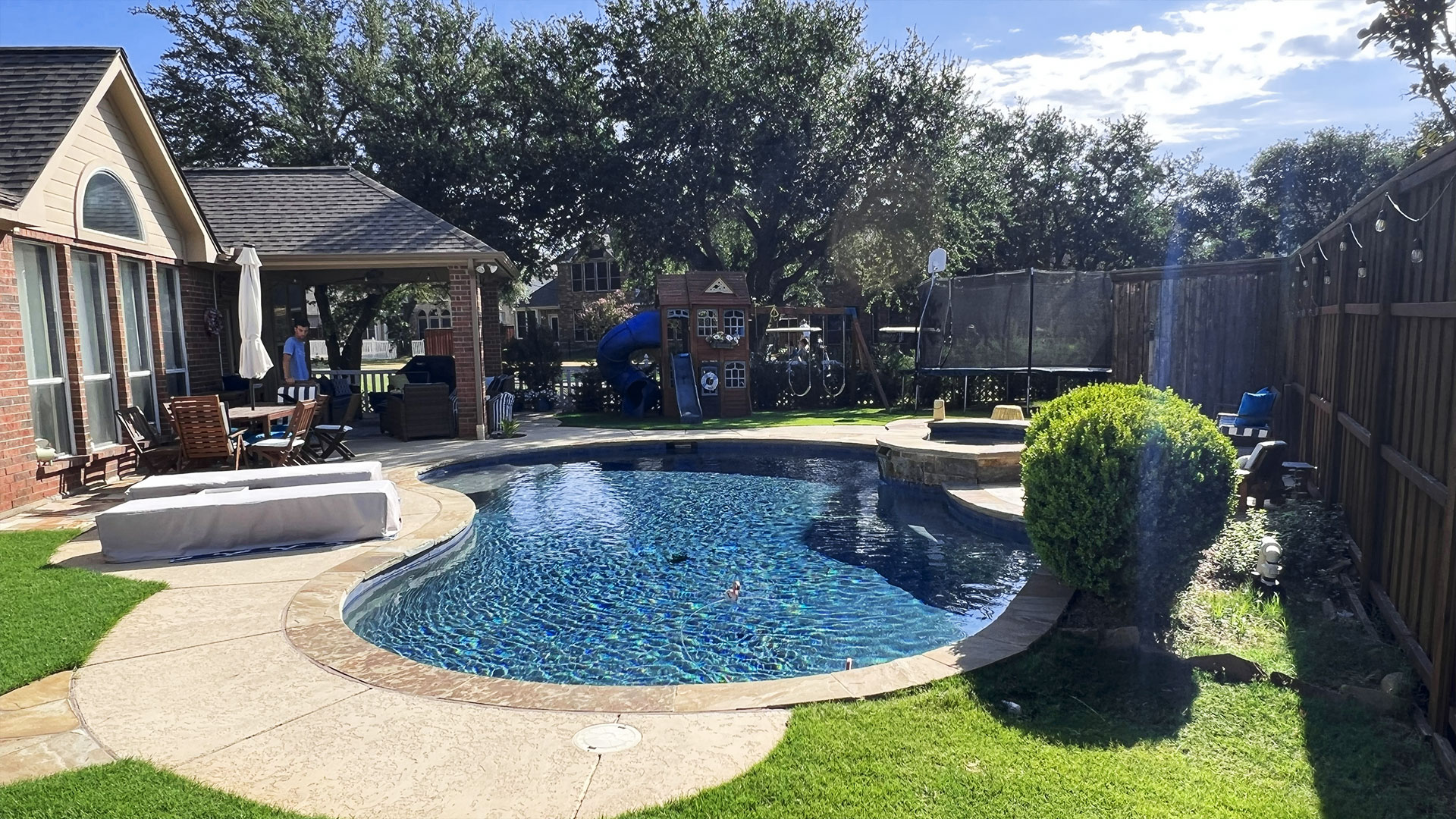 In the Frisco, TX remodel, we revamped the pool and deck area by replacing outdated concrete with Belgard Dimension pavers, complemented by a charcoal Holland Stone border for a modern touch. The former flagstone coping gave way to sophisticated Grey Lueders coping, elevating both aesthetics and durability. This meticulous transformation ensures a stylish and resilient foundation, creating an inviting space for relaxation and recreation.