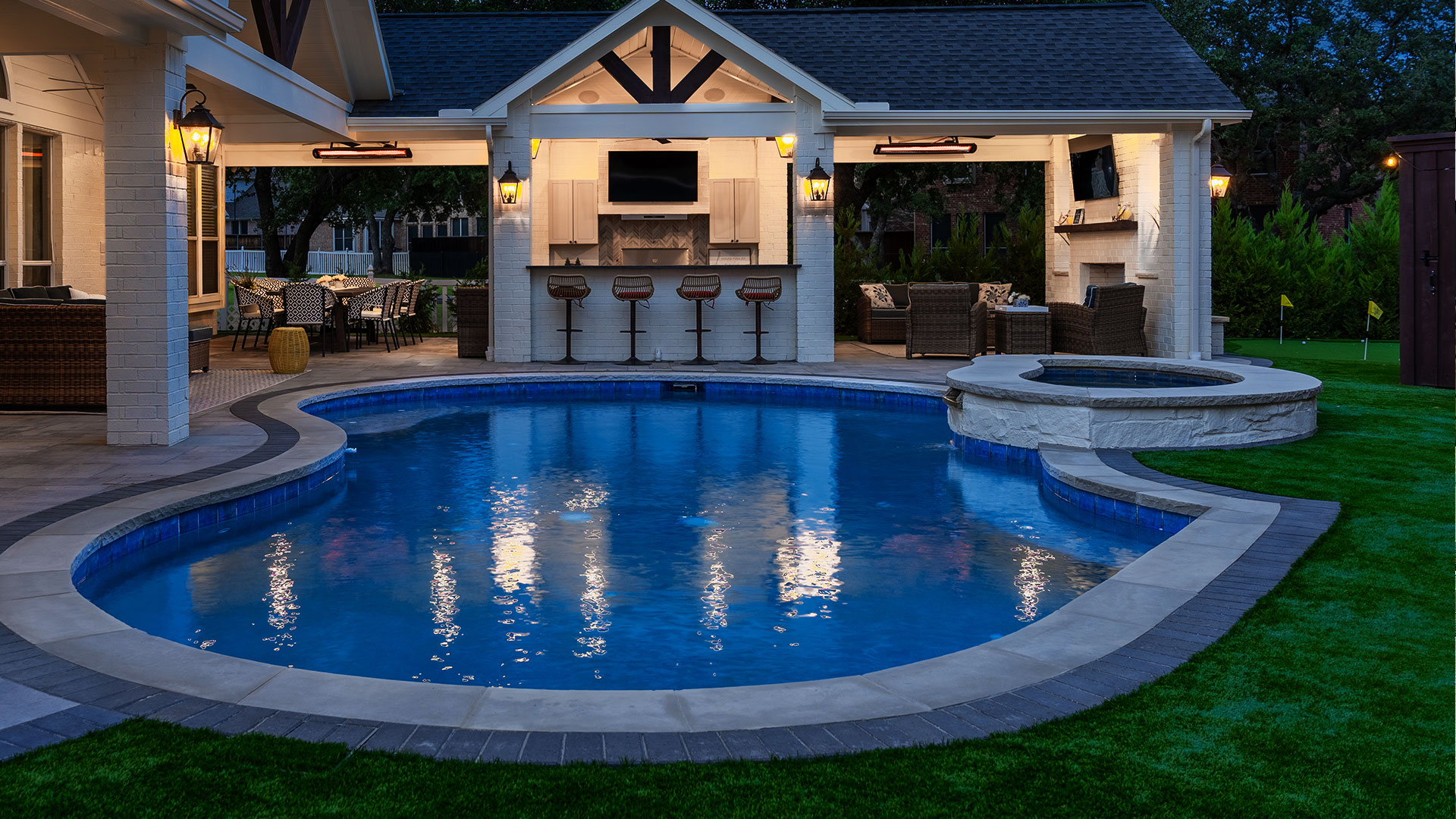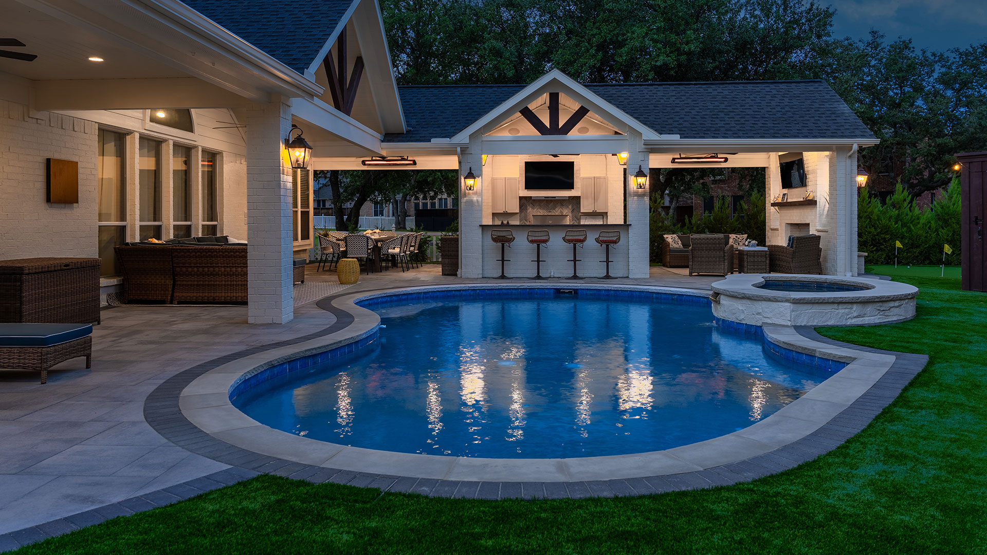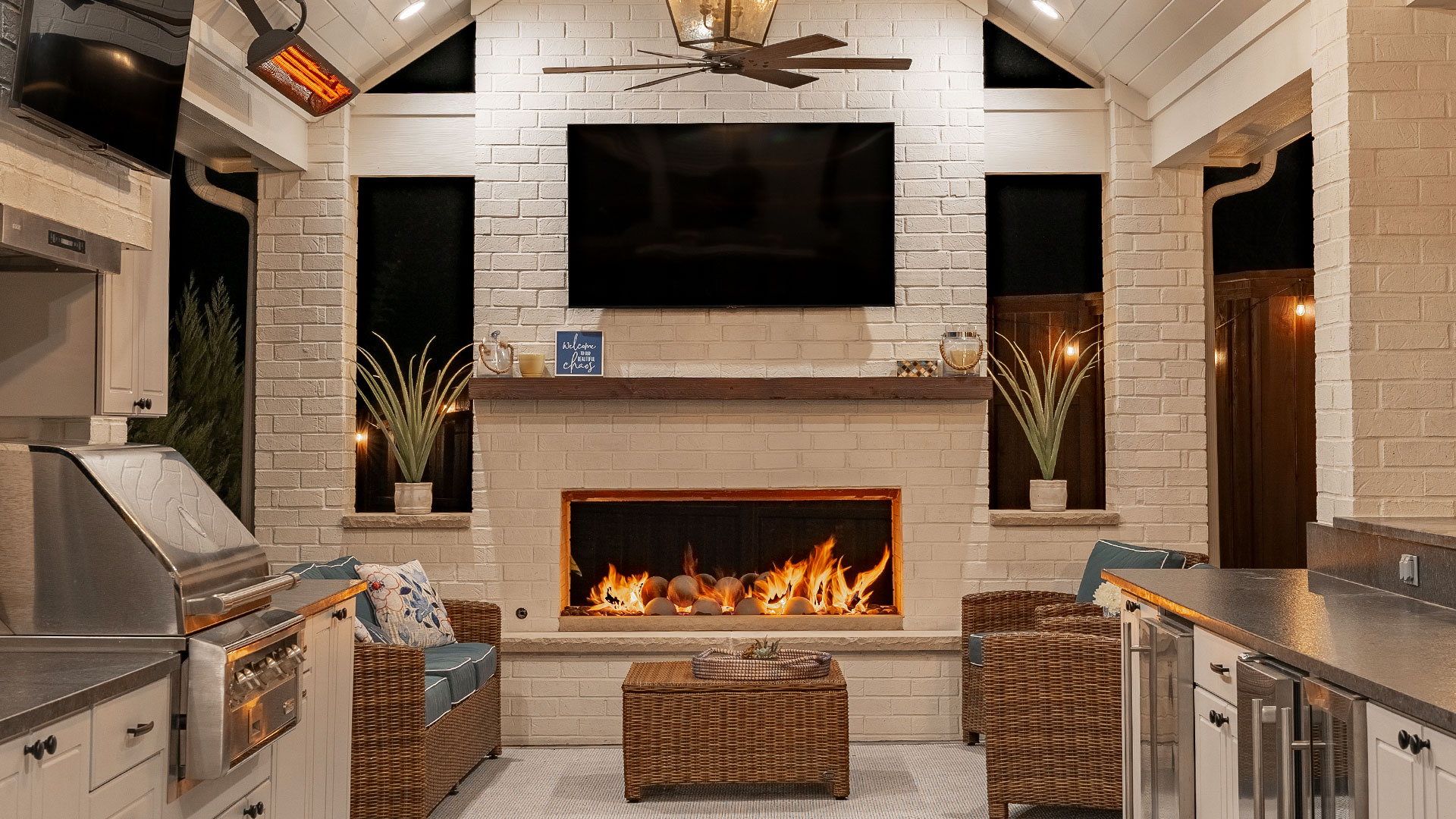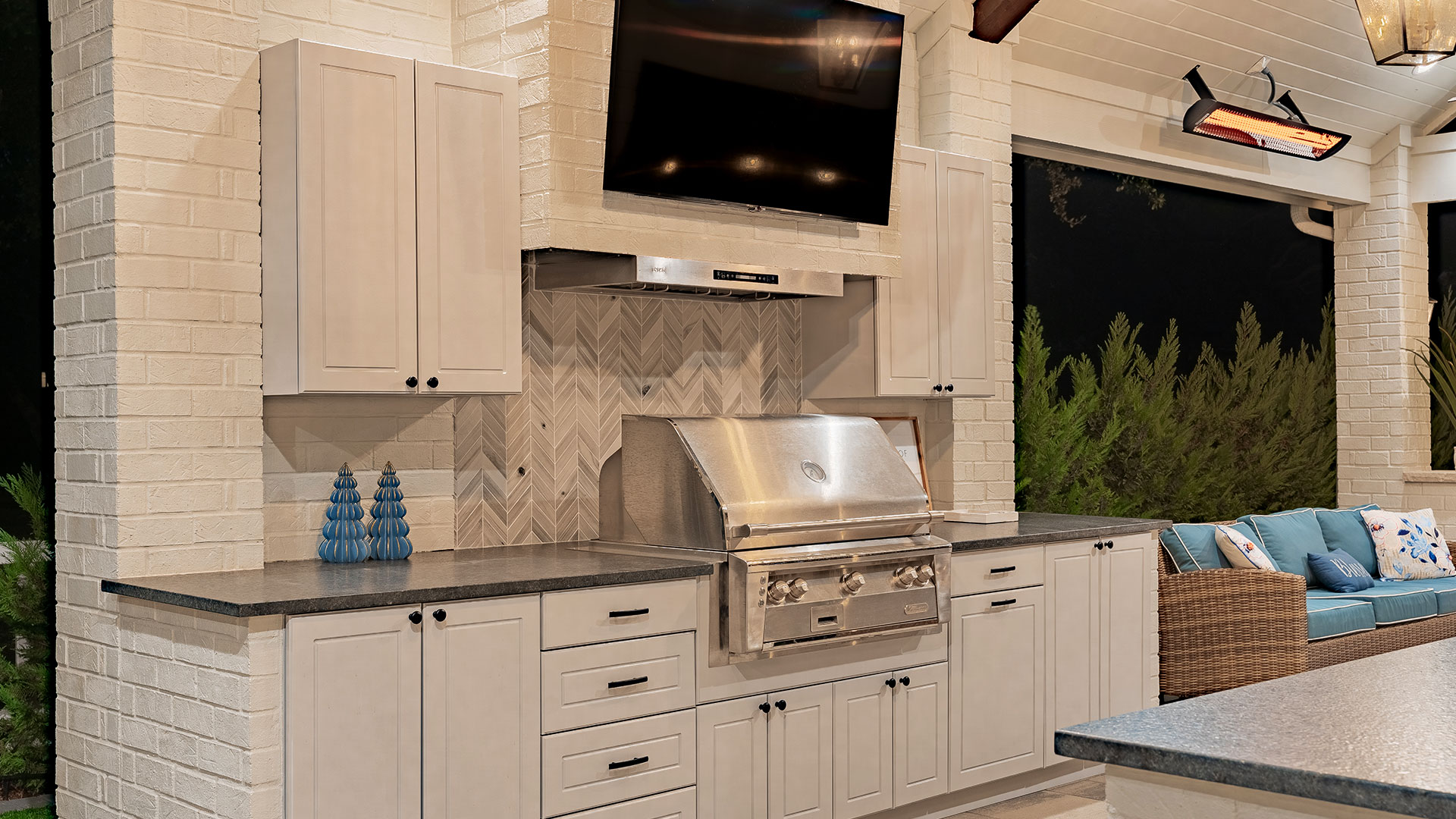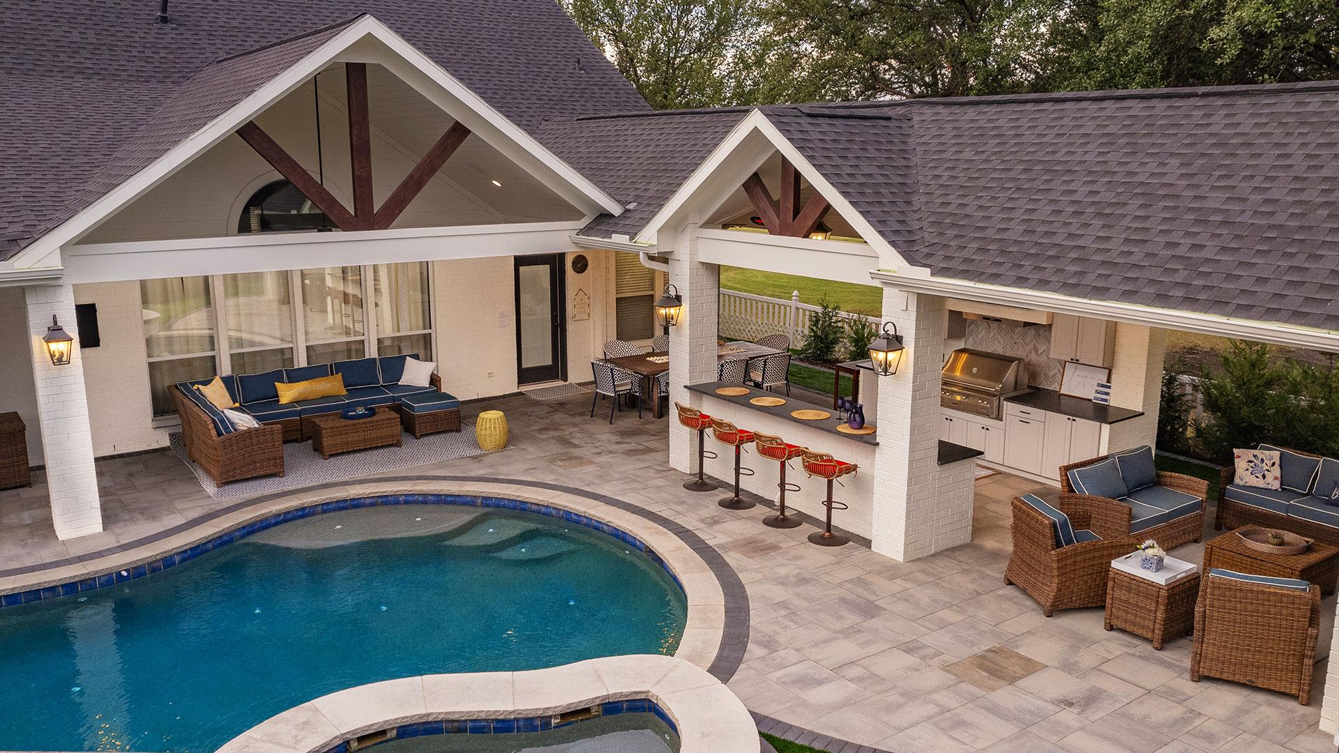 At the heart of the Frisco, TX remodel, our outdoor kitchen vies with the fireplace for the project's focal point. This meticulously crafted kitchen boasts outdoor cabinetry from our esteemed partners at Werever Cabinetry, known for its exceptional durability, easy maintenance, and functional design that maximizes utility. It stands apart from traditional stone-wrapped kitchens, offering a sleek and practical alternative. The space also features a welcoming sitting bar—ideal for poolside lounging or catching a game on the TV subtly integrated into the veneered brick-wrapped vent hood. This outdoor kitchen serves as both a culinary hub and a social centerpiece, combining style and functionality seamlessly in this outdoor oasis.
