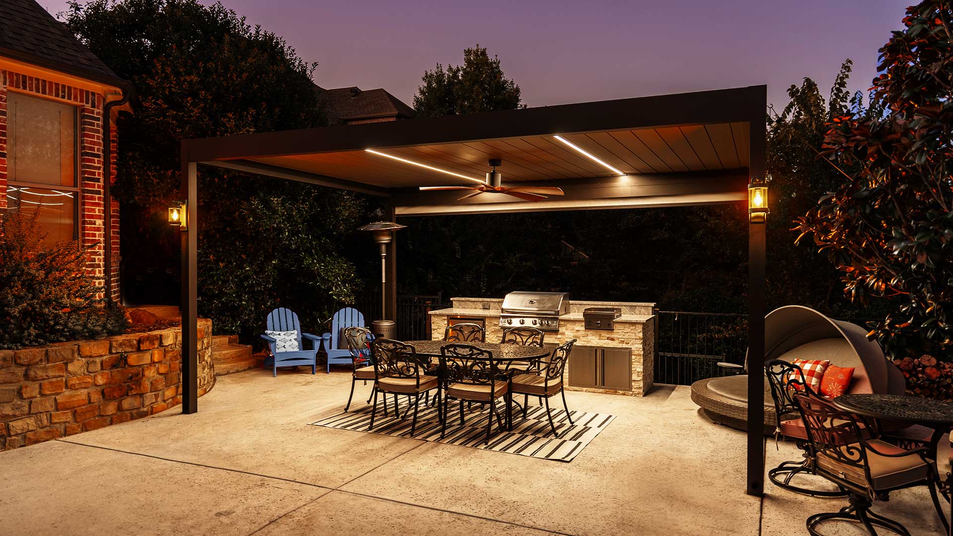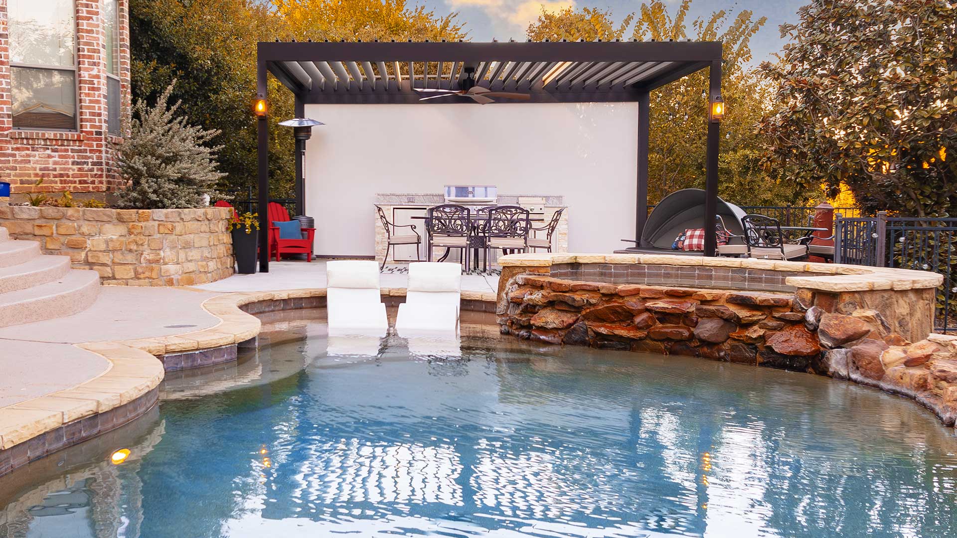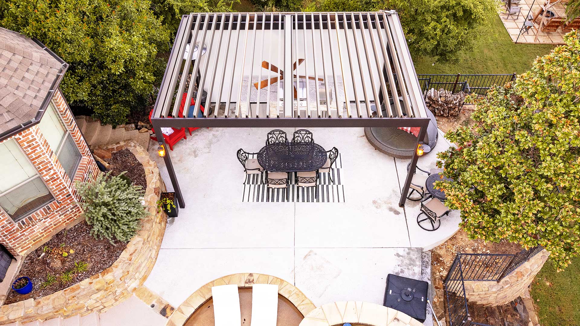 Terrace Outdoor Design elevated this Highland Village backyard with a state-of-the-art Renson louvered pergola and a fully equipped outdoor kitchen. The pergola features motorized louvers operated via a Somfy remote, allowing for easy adjustment to control sunlight and ventilation. When closed, the louvers create a completely rain-tight and waterproof surface, complemented by an integrated drainage system that efficiently manages water runoff.