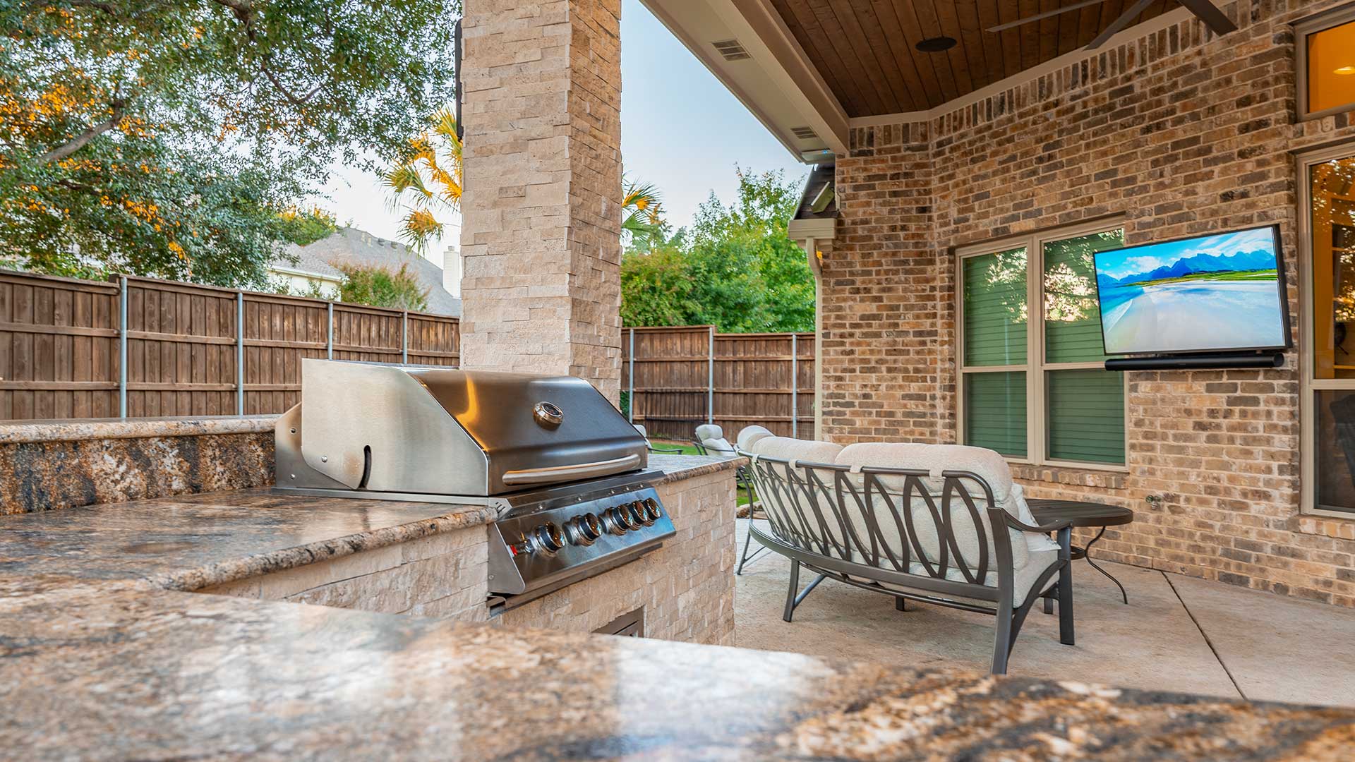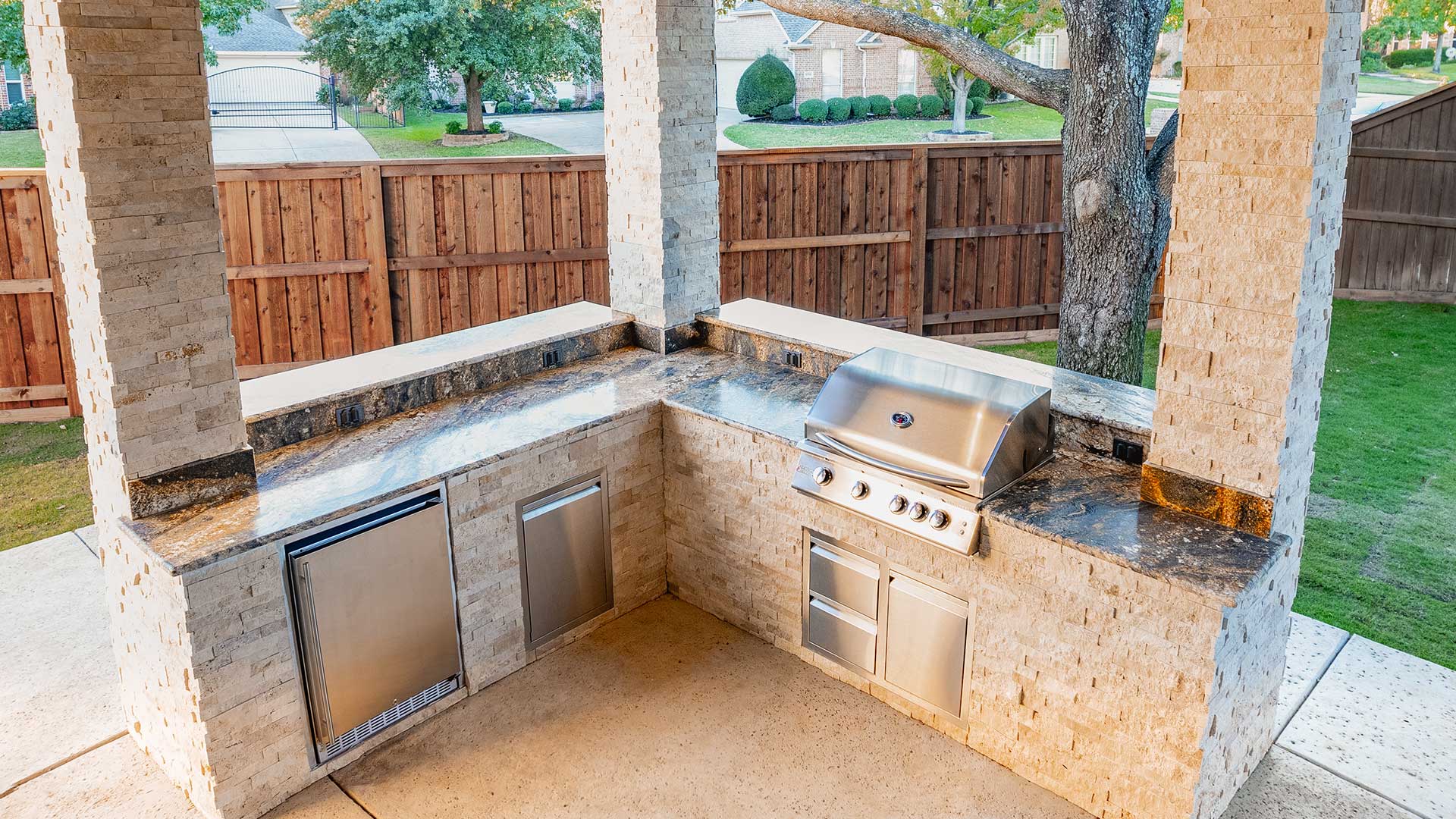 An L-shaped outdoor kitchen becomes the focal point, equipped with top-of-the-line appliances and adorned with premium granite countertops that exude elegance and durability. The kitchen and columns are wrapped in exquisite ledgestone, adding texture and warmth, while the ceiling features pre-stained tongue-and-groove pine, creating a polished, inviting ambiance.